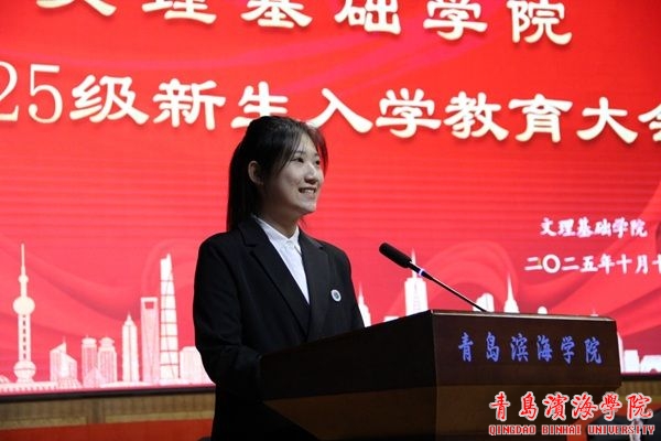 2025级新生代表25汉语言2班张智硕在发言中表达了坚定信念、勤学笃行的决心以及对学院、学校的美好祝愿。