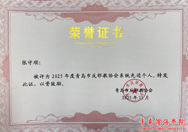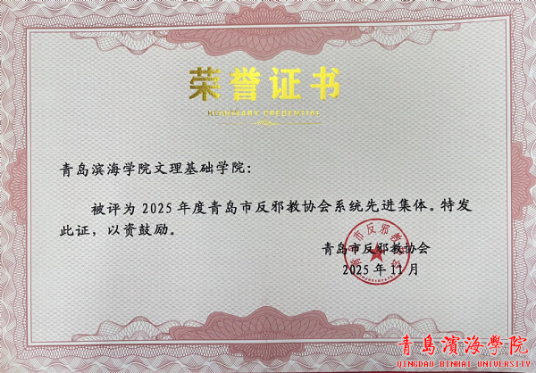 近日,青岛市反邪教协会公布2025年度全市反邪教协会系统先进集体名单,文理基础学院凭借在反邪教宣传教育工作中的突出成效与创新实践,成功获评先进集体荣誉称号,张守顺同志被评为2025年度青岛市反邪教协会系统先进个人。